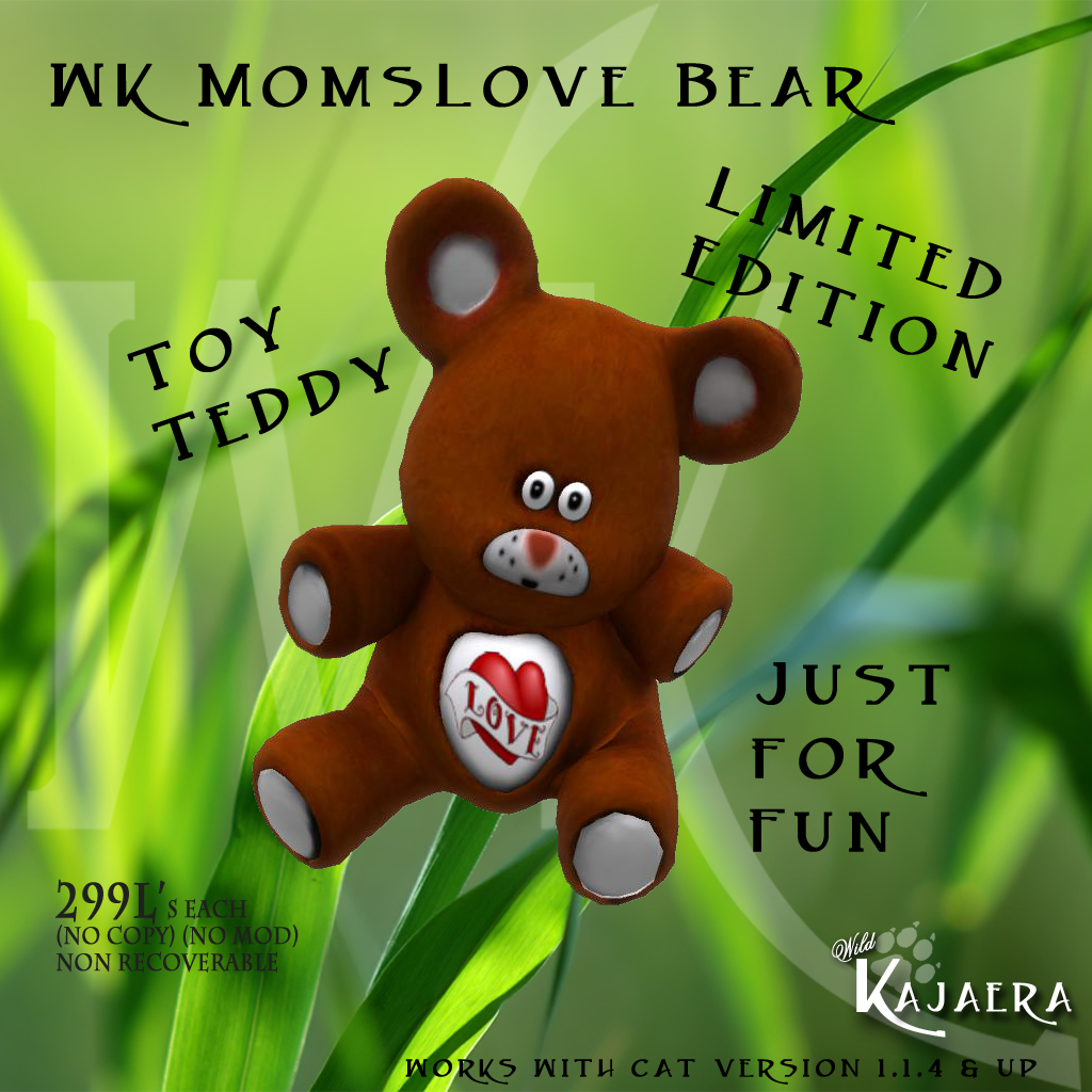 The next installment in the limited edition teddy bears. In honor of Mothers Day we have made this traditional style teddy bear for your cats to cary about and get comfort from while you are away from them in second live and attending things in your real life. These bears are over size and will be out for the rest of the month of May into early June. You can find them at the two main store locations.