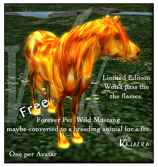 WK is so excited to release this limited edition Wild Mustang in honor of the Firestorms 8th birthday. Though it is a bit out of the norm for us as it is not a traditional looking horse, it was designed very specially for Firestorm. If you choose to convert the animal to a breedable animal with the Wild Thing Kit it will not pass this beautiful flame coat. When converted to the breedable animal instead of the flames you will have the chance to pass the Black Dapple coat. The mane and tail will pass something different as well but the rest of the traits of the animal will pass as normal.