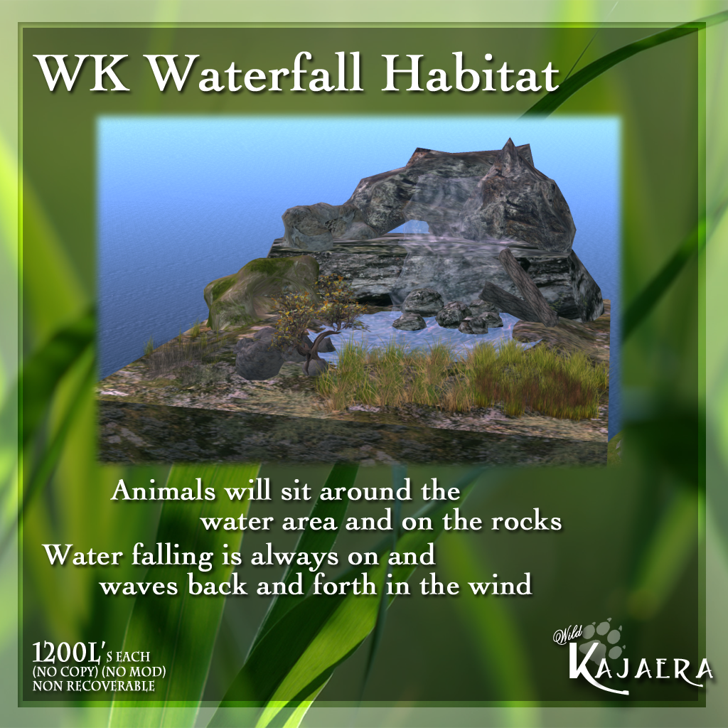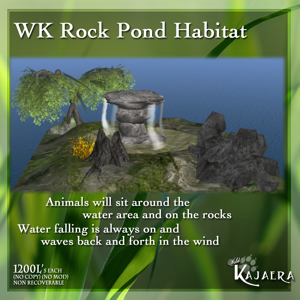 New Habitats are out for sale at the WKU. These 2 Habitats were both designed by Darkstone Aeon. One is a Waterfall with a pool area surrounded by a small tree and some tall grass. The other is a Rock Pond with a water feature in the middle. Both have several sleeping spots for the animals. There are two ways in which you can use them in your landscape for your animals to enjoy, or as a restricted habitat to keep your animals with in a certain area if you use the Habitat feature in the Motion Menu. Menu>Motion>Range>In Habitat.