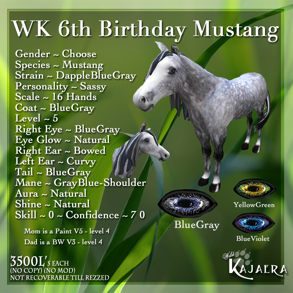 As you can see the mustang is full of traits and has a high enough confidence that its ready for training. The parents have brand new coats, mans and tails. You may find the Mustang for sale here http://maps.secondlife.com/secondlife/WK%20Wild%20Kajaera/111/121/22 at the WKU.