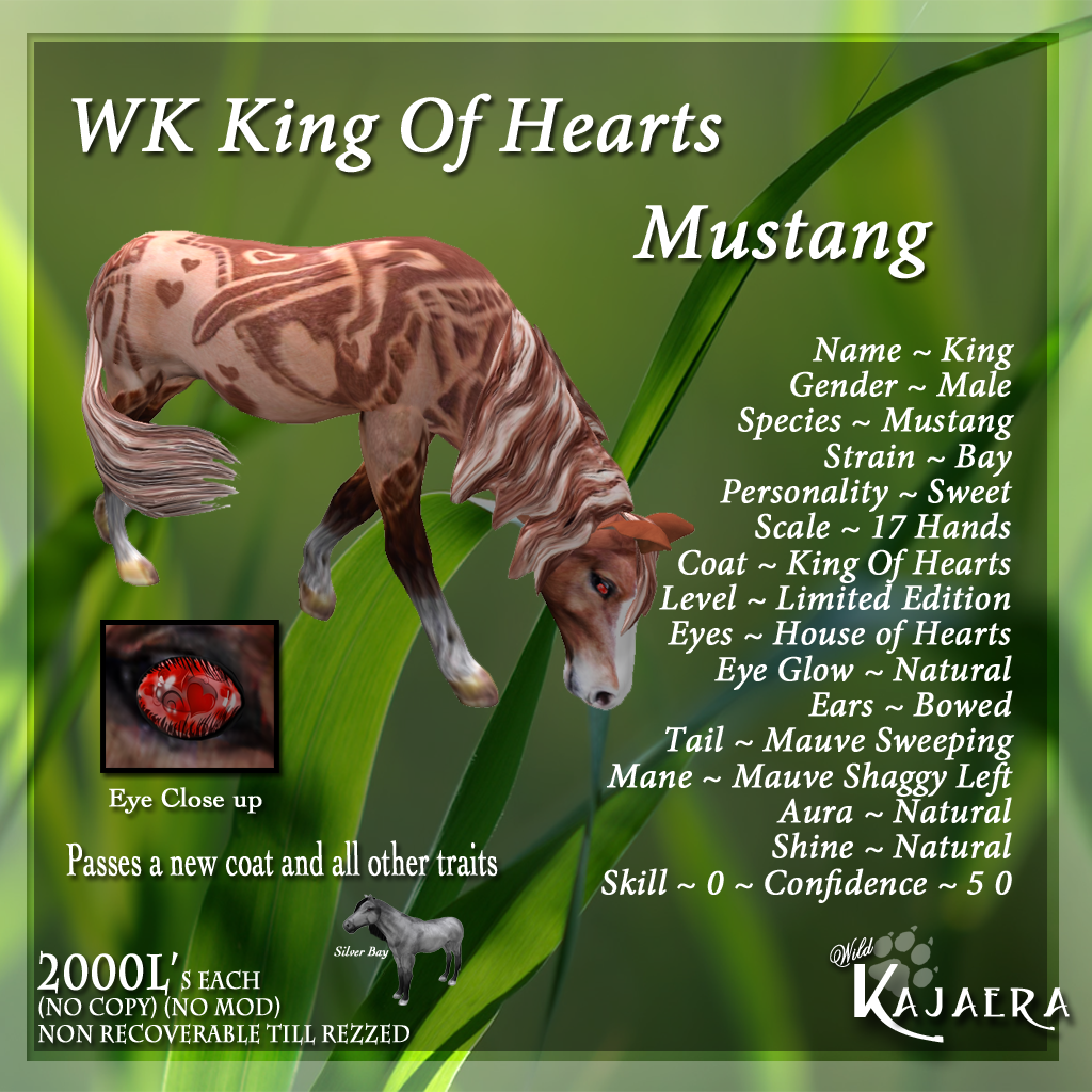 For the Horse Lover we have a beautifully shaved King of Hearts Mustang in a Bay strain for you to add to your breeding line. The Shaved coat does not pass it self but will if the selected winning coat pass a beautiful silvery Bay. The King of Hearts also introduces new tails and mane coloring.