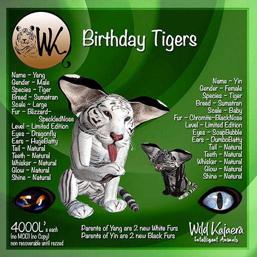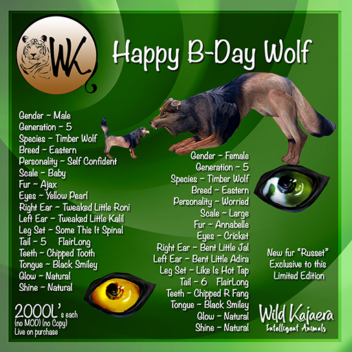 WK – is celebrating 8 wonderful years in the Second Life world. We are happy to have you along for the journey. The Birthday animals will be available until the 15th of the month.