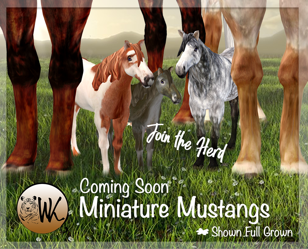 The Leprechauns have shrunk the Mustangs, just in time for St. Patricks Day. These Miniature Mustangs are adorable. These will have some differences over the Wild Mustangs, like with the Real World Miniature Horses these even the Mammoth scale will not be rideable as they are barely above the shoulder of a full size horse. The scales will be similar to that of the cats as you cant size these little one up by hands. They will also have all new coats for you to discover. They will not be able to breed with the big ones as that would just be painful for the Mini Mamas.